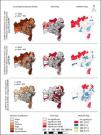 In table 1, we can observe the correlation of Pearson among the epidemiological and socioeconomic indicators, with statistical significance. A positive correlation was found between IMHD and the coefficients of detection in the general population and in younger than 15 years. The dimension longevity of IMHD, FIMD and FIMD “health” was only correlated to the coefficient of general detection. The index of social vulnerability (dimension work and income) was inversely correlated to the coefficient of general detection. The indexes Theil-L and Gini were correlated to the coefficients of detection in younger than 15 years and with the coefficient of grade II physical disability. The three epidemiological indicators were correlated to the IPESE indicator and its dimension “economy and finances”. Additionally, Moran’s index demonstrated that all these indicators had a spatial dependency. It is worth highlighting that all correlations were considered weak.